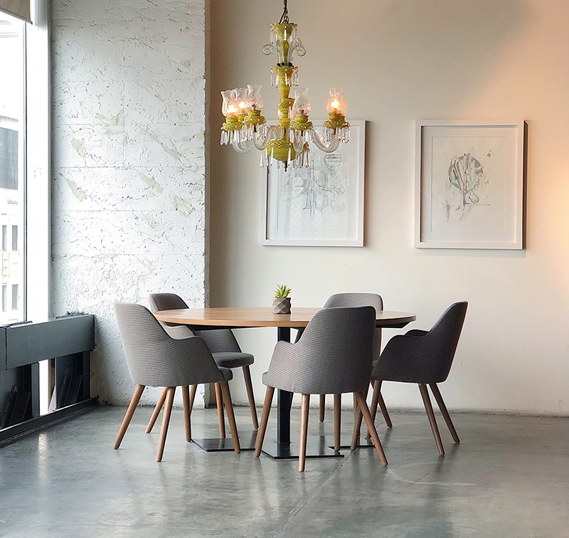 The dining table is a bit of a breath of nature, new but still close enough and connecting guests with family members thanks to the clever use of extremely special green.
